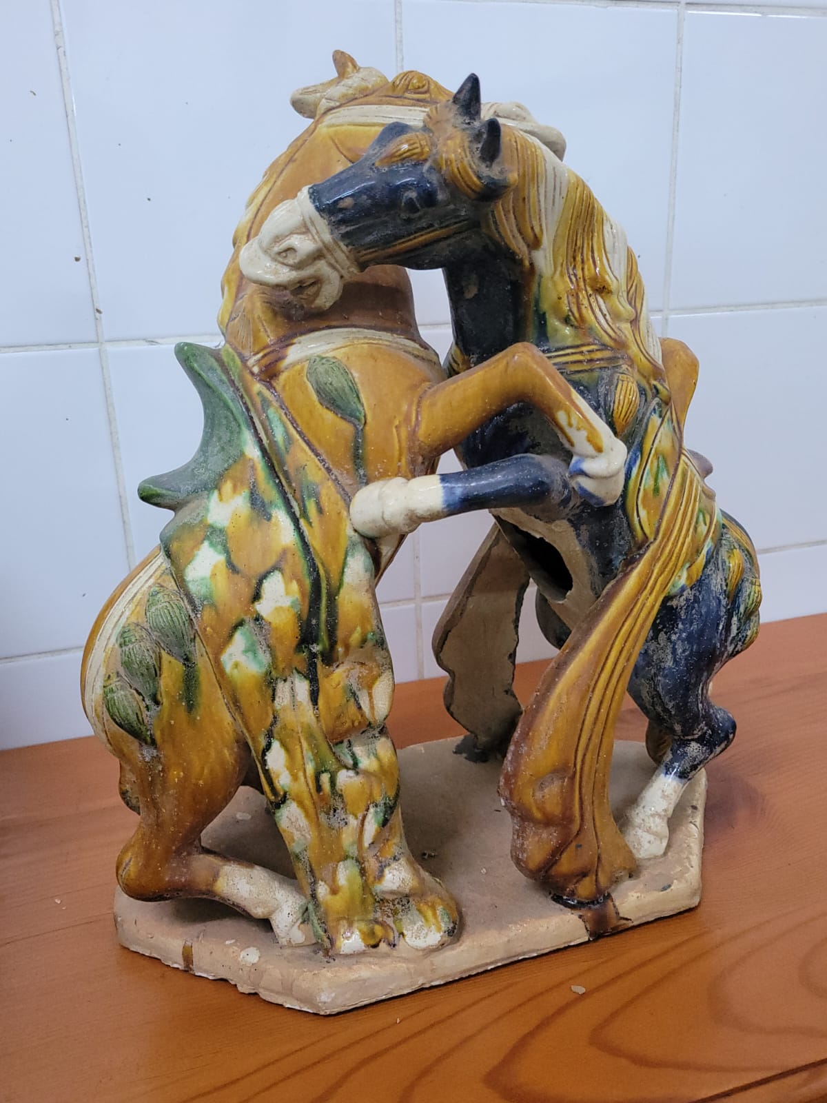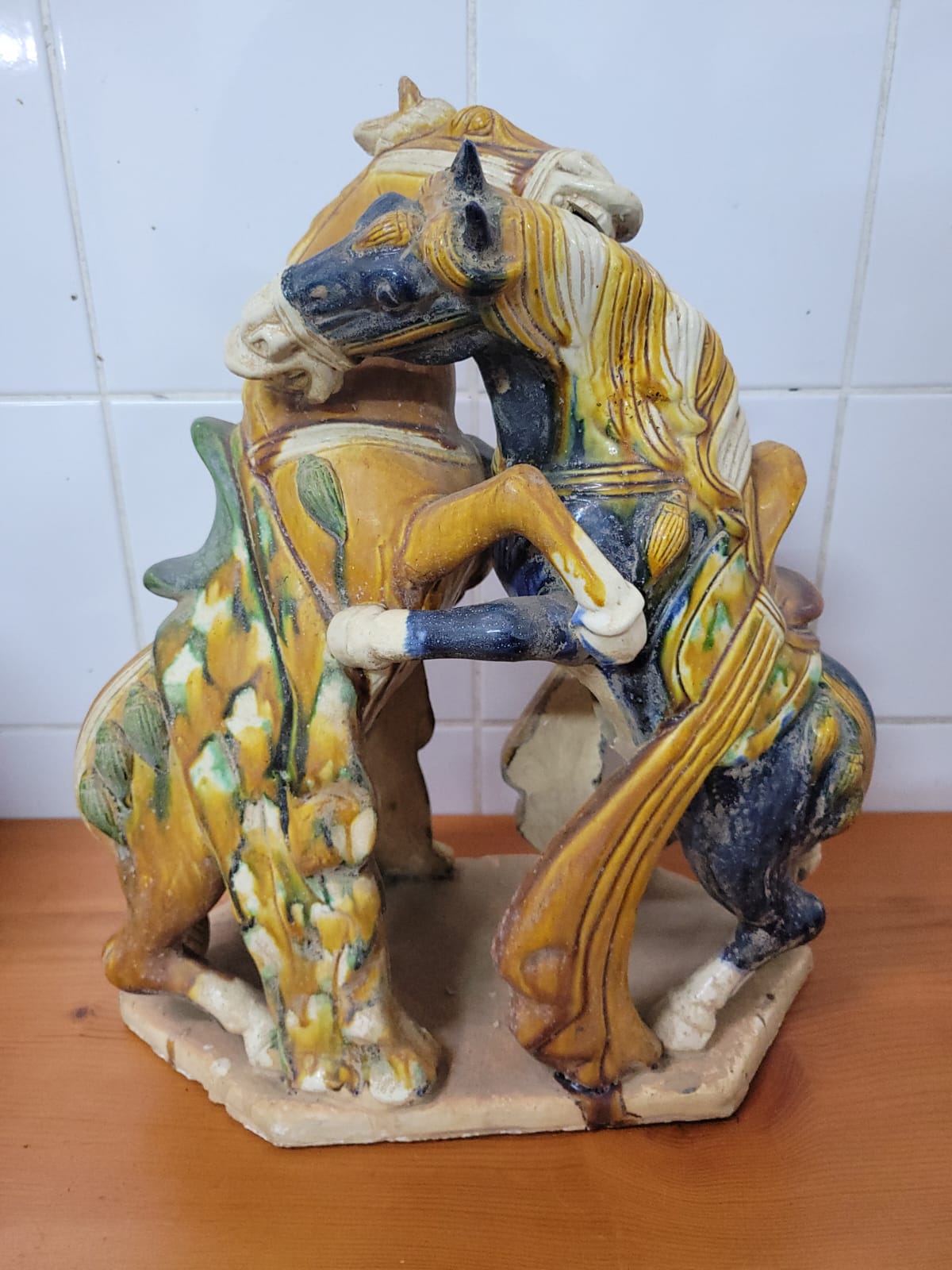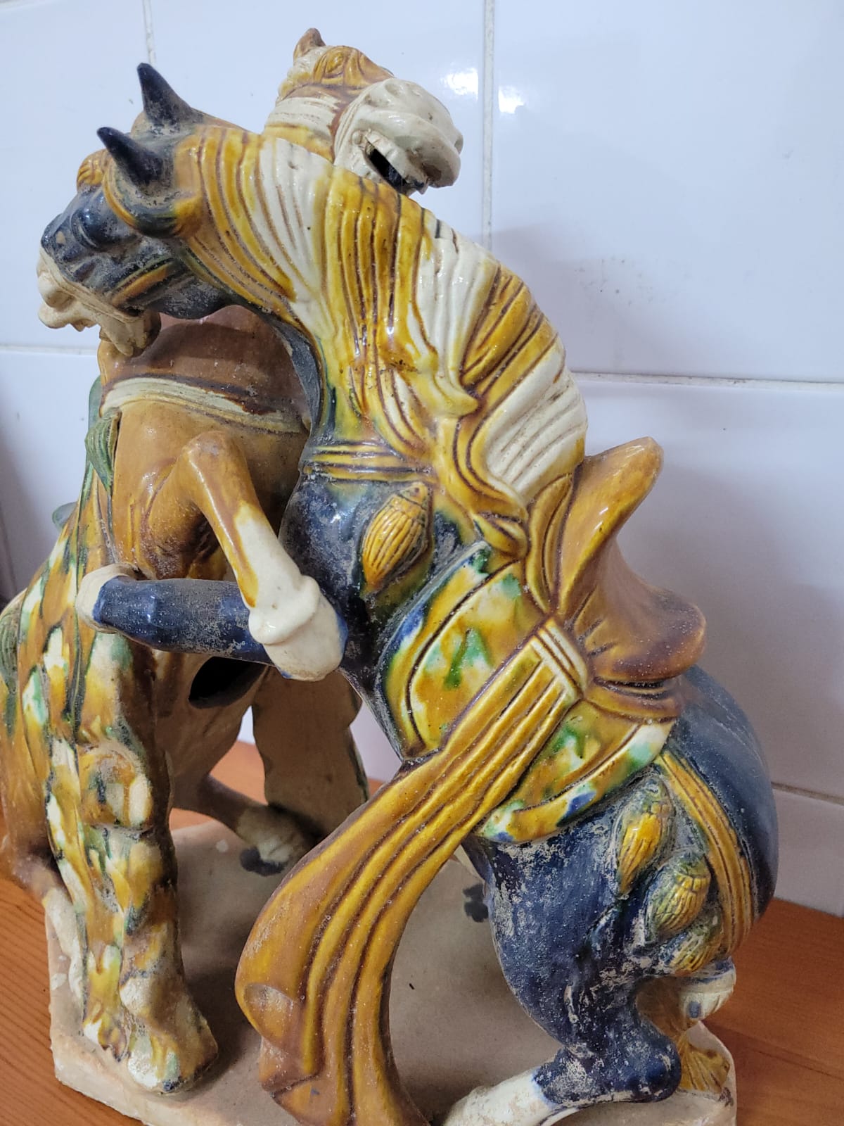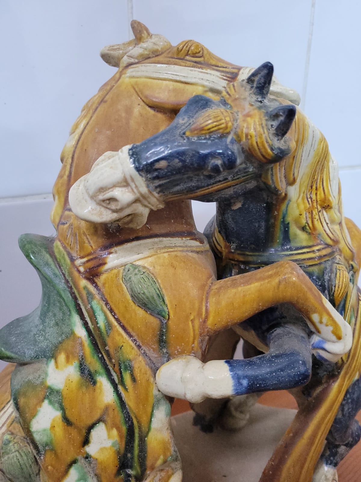 VINTAGE DECORATIVE CHINESE TANG DYNASTY STYLE POTTERY HORSES. GLAZED IN SHADES OF YELLOW, GREEN AND BLUE. NO CHIPS OR CRACKS. 40CM X 40CM. APPROXIMATELY.