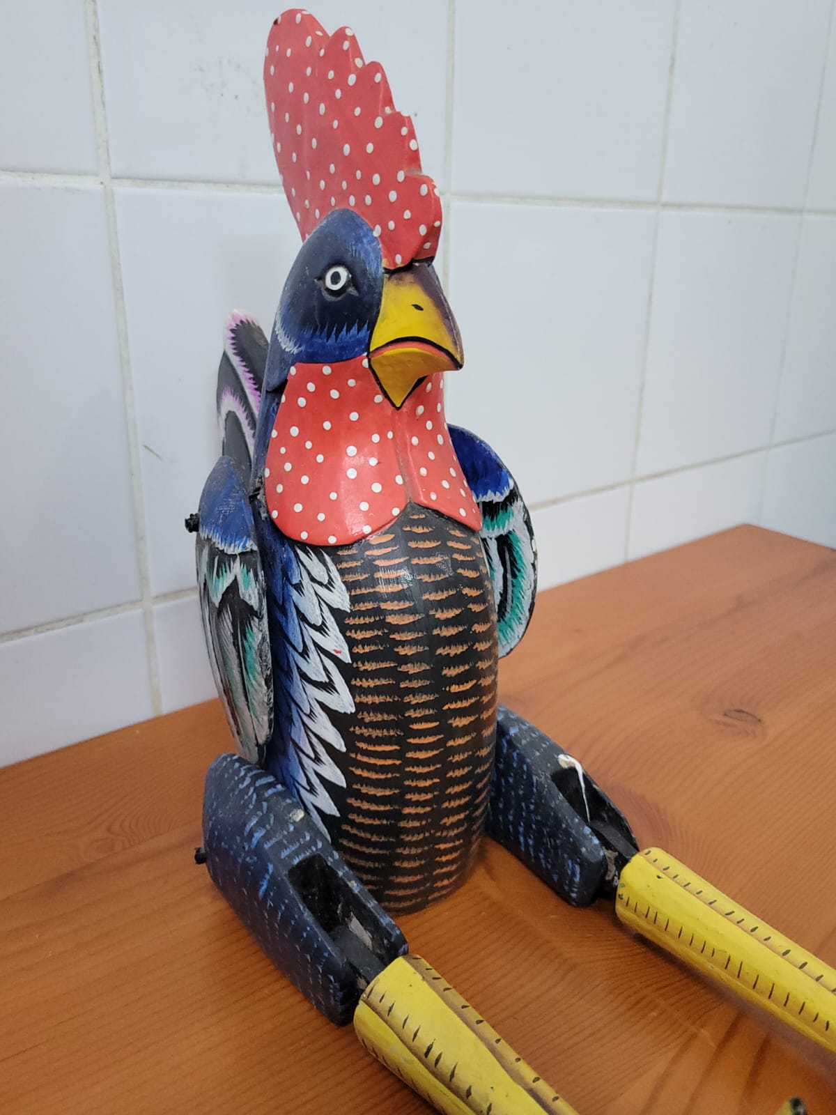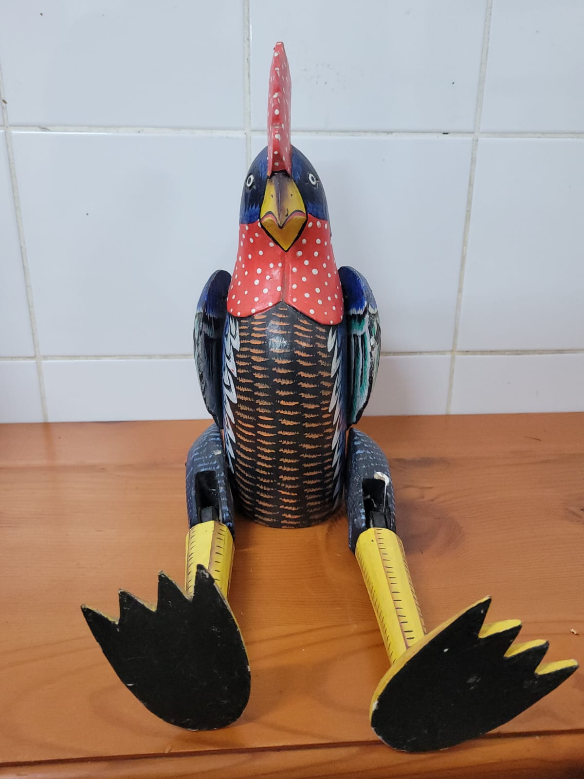HAND CARVED AND PAINTED LARGE WOODEN CHICKEN. ARTICULATED LEGS AND JOINTED WINGS. VIBRANT COLORS.