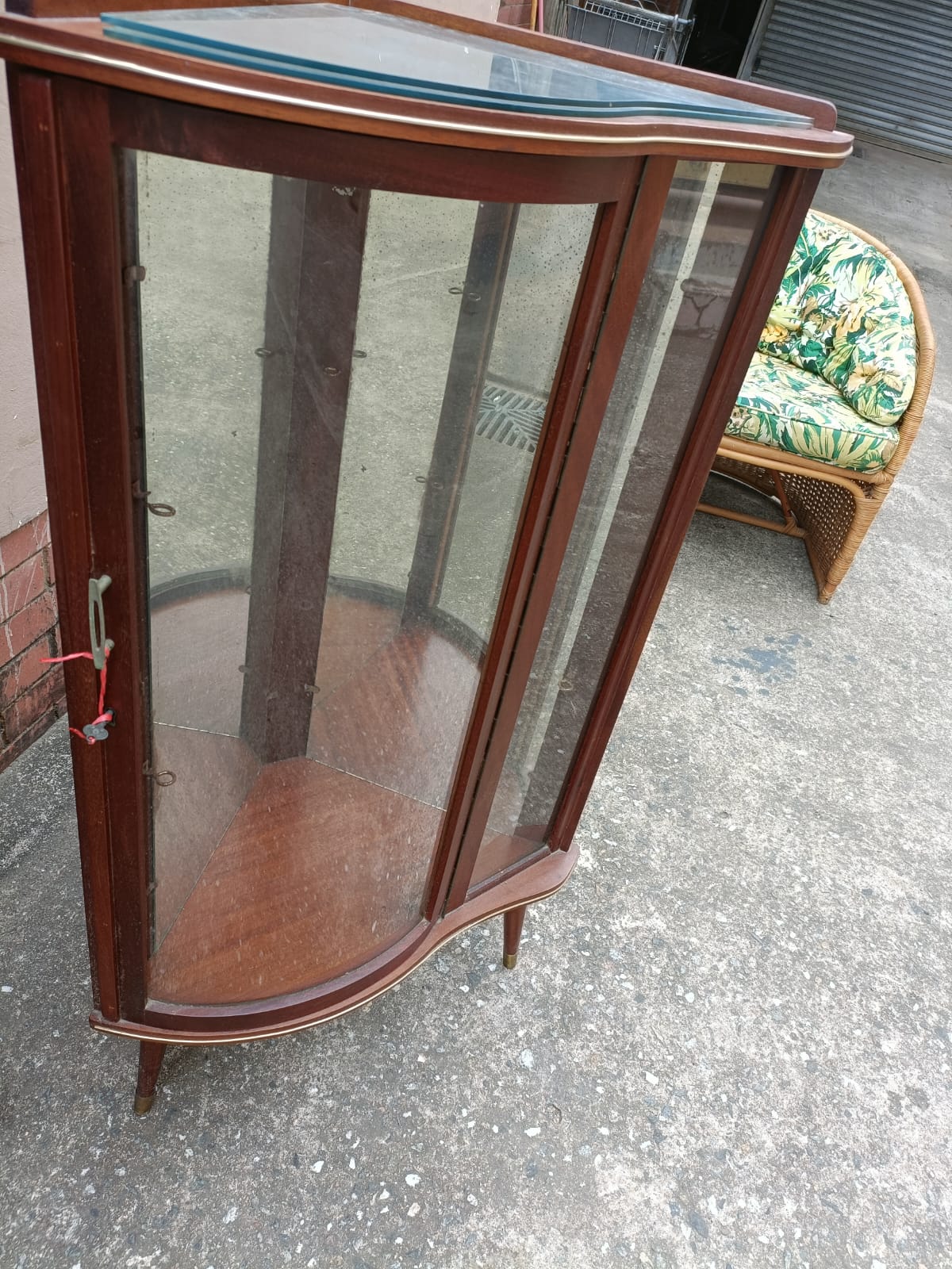 VINTAGE MEDIUM SIZED CORNER CURIO /COLLECTABLE CABINET. CURVED GLASS AND GLASS SHELVES.