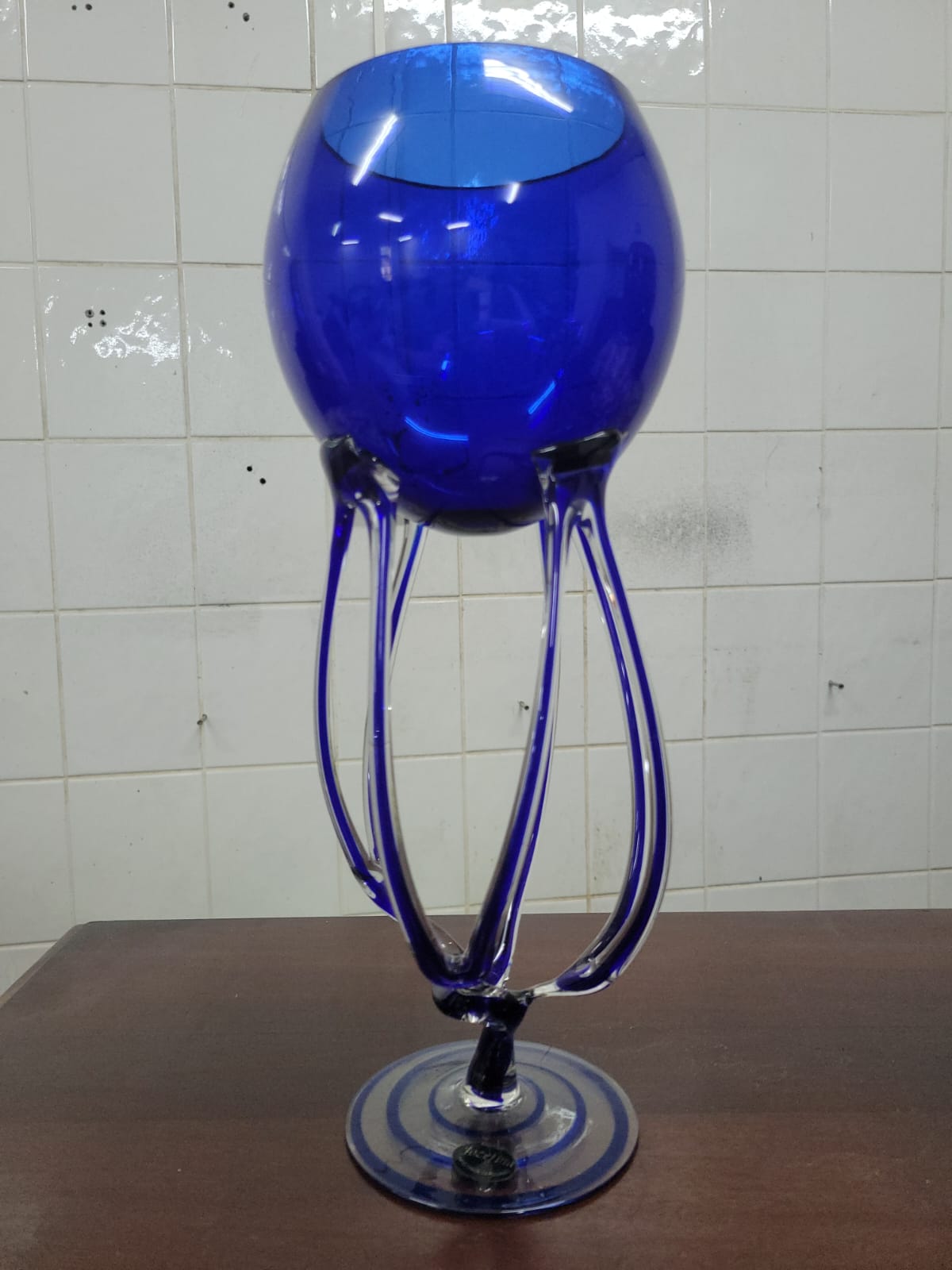 JOZEFINA KROSNO HANDBLOWN COBALT BLUE ART GLASS. JELLYFISH PEDESTAL BOWL. NO CHIPS OR CRACKS. 40CM APPROXIMATELY.